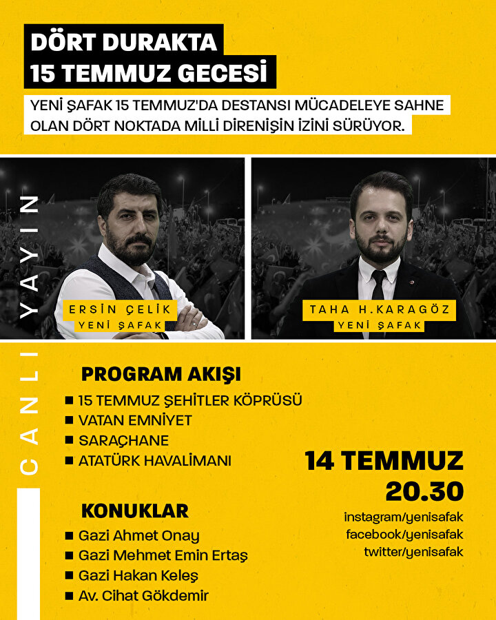 Yeni Şafak İnternet Yazı İşleri Müdürü Ersin Çelik ve Yeni Şafak Editörü Taha H. Karagöz, 15 Temmuz Şehitler Köprüsü, Vatan Caddesi'ndeki İstanbul Emniyet Müdürlüğü, Saraçhane ve Atatürk Havalimanı'nda o gecenin tanıklarından Gazi Ahmet Onay, Gazi Mehmet Emin Ertaş, Gazi Hakan Keleş ve Avukat Cihat Gökdemir ile şanlı direnişi konuştu.