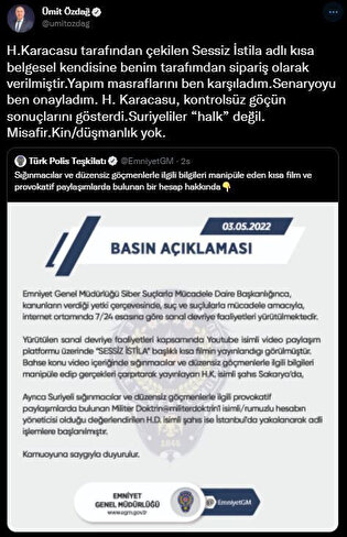 Karacasu'nun gözaltına alınmasının ardından son günlerde göçmenlere ilişkin yaptığı çıkışlarla gündeme gelen Zafer Partisi Genel Başkanı Ümit Özdağ bir açıklama yaptı. Özdağ, açıklamasında şu ifadeleri kullandı: