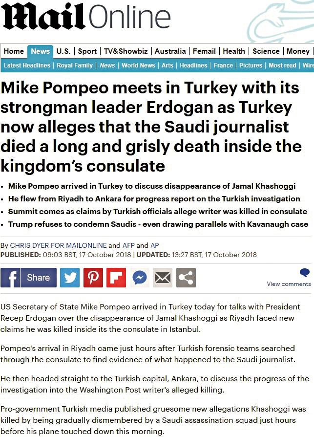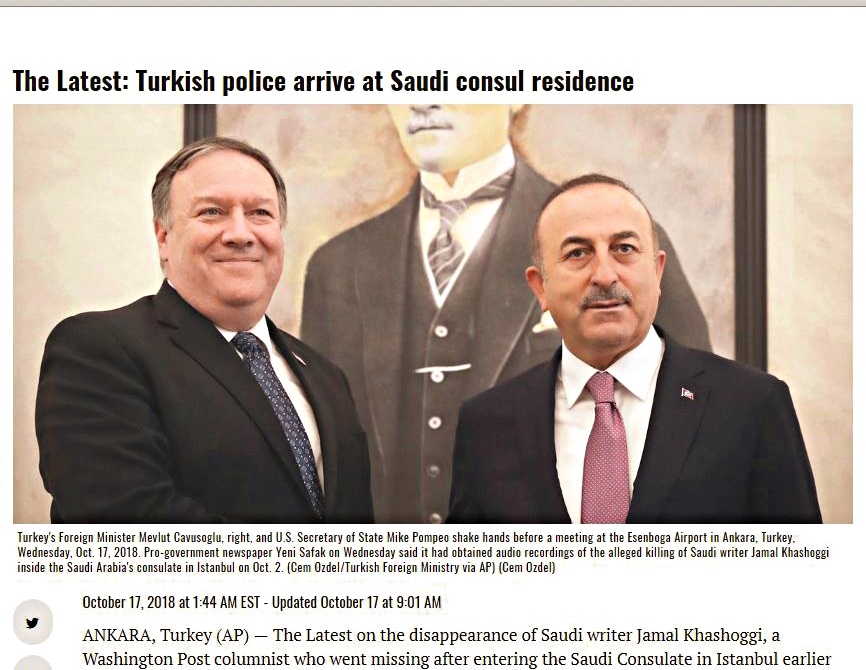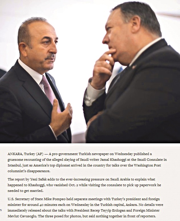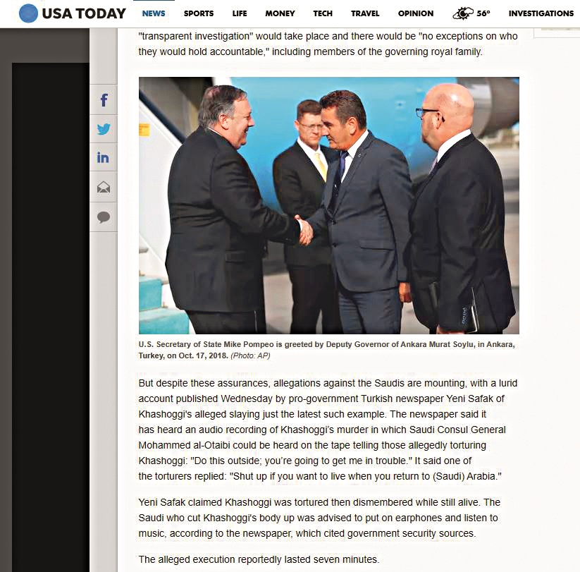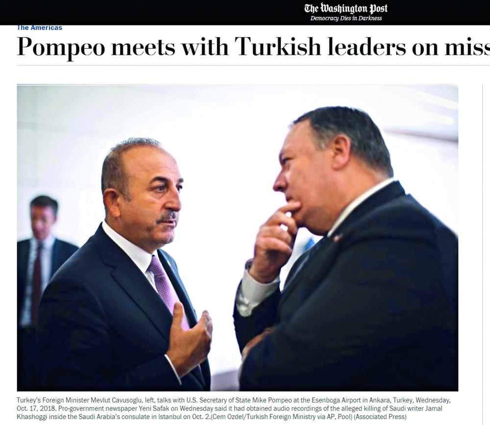 AP, Yeni Şafak'ın paylaştığı cinayetin ayrıntılarını "dehşet verici" ifadeleriyle internet sayfasına taşıdı. AP ayrıca, aynı gün ABD Dışişleri Bakanı Mike Pompeo'nun da Kaşıkçı cinayetiyle ilgili Cumhurbaşkanı Recep Tayyip Erdoğan ile görüşmek için Türkiye'de olduğunu hatırlattı.
