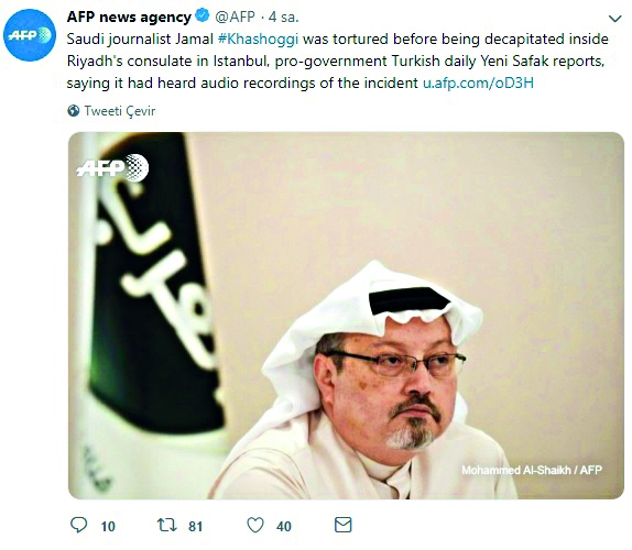 Yeni Şafak'ın, Suudi gazeteci Cemal Kaşıkçı cinayetine ilişkin haberi dünyanın gündemine oturdu. Haber, dünya medyasında geniş yankı bulurken uluslararası ajanslar AFP ve AP, Yeni Şafak'ın ulaştığı ses kayıtlarını son dakika olarak geçti. Deutsche Welle, Sky News ve Al Jazeera televizyonları haberi canlı yayınlarına taşıdı. Kaşıkçı'nın yazılarının yayınlandığı Washington Post gazetesi de haberi son dakika olarak paylaştı.