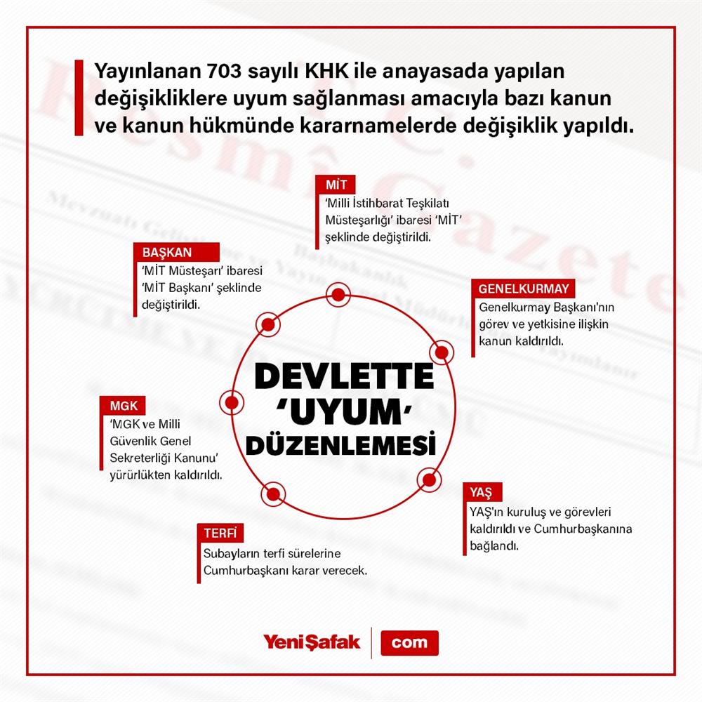 Anayasa değişikliklerine uyum sağlanması amacıyla bazı Kanun ve KHK'lerde değişiklik yapılmasını içeren 703 sayılı KHK, Resmi Gazete'de yayımlandı.
