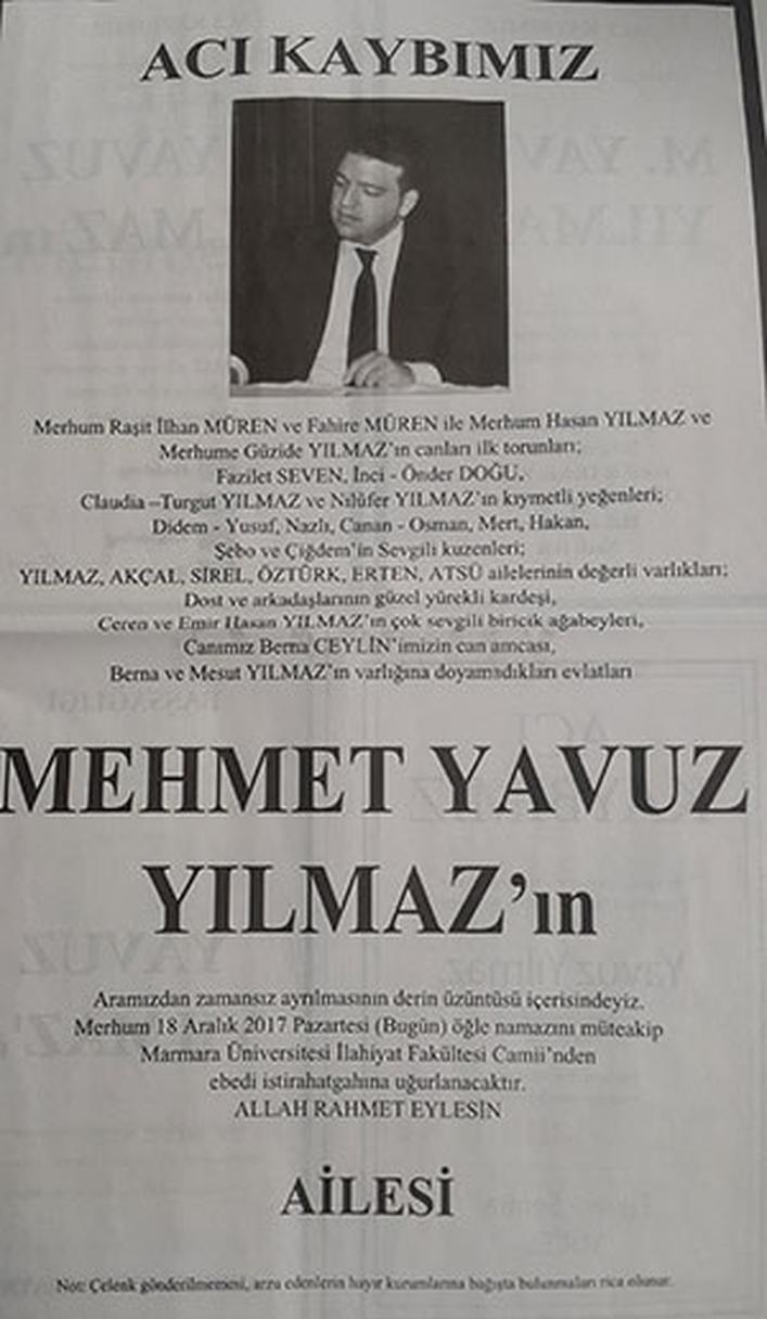 Eski Başbakan Mesut Yılmaz'ın oğlu Yavuz Yılmaz bugün son yolculuğuna uğurlanıyor. Yavuz Yılmaz'ın cenazesi ailesi tarafından hastaneden alındı. Yavuz Yılmaz'ın naaşı Marmara İlahiyat Camiisi'ne getirildi. Yılmaz ailesi adına bugün gazeteye verilen ölüm ilanı ile cenazeye çelenk gönderilmemesi istendi.