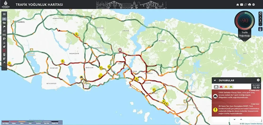 İstanbul'da akşam saatlerinde trafik yoğunluğu oluştu. İstanbul Büyükşehir Belediyesi Trafik Yoğunluğu Haritası verilerine göre saat 18.30 itibariyle