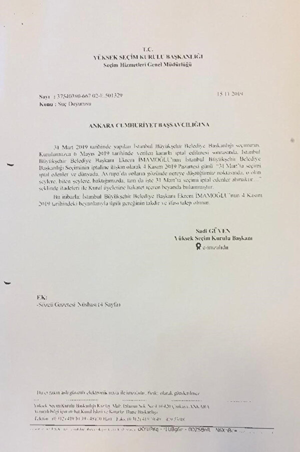 “31 Mart 2019 tarihinde yapılan İstanbul Büyükşehir Belediye Başkanlığı seçiminin Kurulumuzca 6 Mayıs 2019 tarihinde verilen kararla iptal edilmesi sonrasında, İstanbul Büyükşehir Belediye Başkanı Ekrem İmamoğlu’nun İstanbul Büyükşehir Belediye Başkanlığı seçiminin iptaline ilişkin olarak 4 Kasım 2019 pazartesi günü ‘31 Mart’ta seçimi iptal edenler ve dünyada, Avrupa’da onların gözünde nereye düştüğümüz noktasında, o olan şeylere, biten şeylere baktığımızda tam da işte 31 Mart’ta seçimi iptal edenler ahmaktır’ şeklinde ifadeleri ile Kurul üyelerine hakaret içeren beyanda bulunmuştur. Bu itibarla İstanbul Büyükşehir Belediye Başkanı Ekrem İmamoğlu’nun 4 Kasım 2019 tarihindeki beyanlarıyla ilgili gereğinin takdir ve ifası talep olunur.”