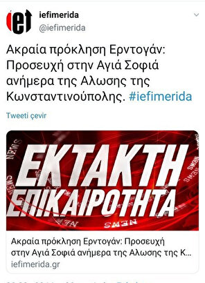 - Ayrıca Ayasofya'daki Fetih Suresi'nin okunmasına tepki olarak Yunan medyasında, "Helenizm'e karşı büyük bir meydan okuma" cümleleri yer verildi.