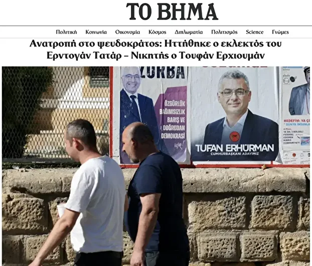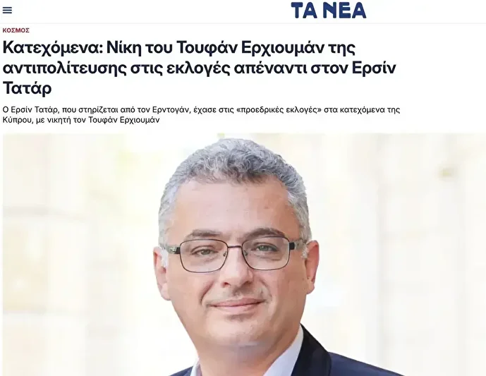Ta Nea gazetesi ise manşetten verdiği haberde, "Yüksek Seçim Kurulu'nun verilerine göre, Türkiye Cumhurbaşkanı Tayyip Erdoğan'ın desteğini arkasına alan Kıbrıs Türk Lideri Ersin Tatar, işgal altındaki Kuzey Kıbrıs'ta yapılan 'cumhurbaşkanlığı seçimlerinde' yenilgiye uğradı." ifadelerine yer verdi.