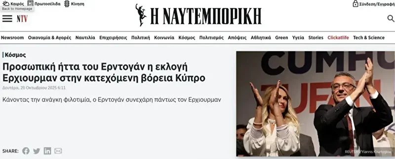 Ülkenin önde gelen finans gazetesi Naftemporiki ise "Erhürman'ın işgal altındaki Kuzey Kıbrıs'ta seçilmesi Erdoğan için kişisel bir yenilgidir." ifadelerine yer verdi.