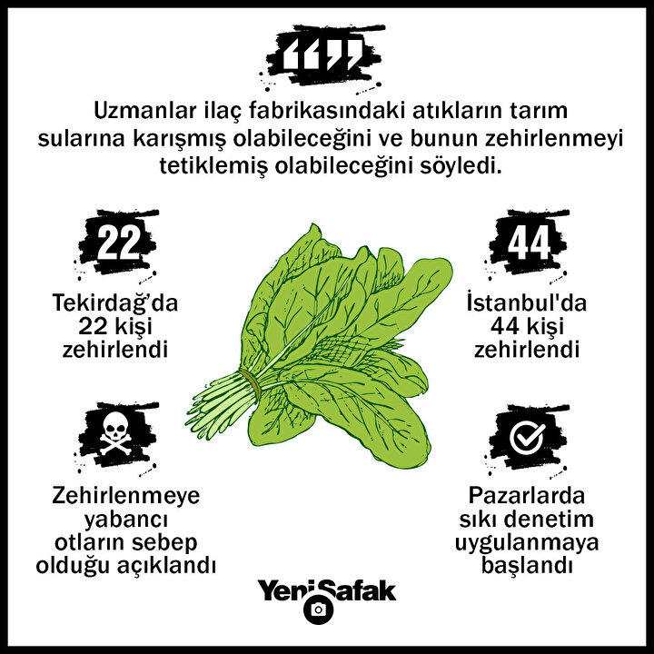 Marmara Bölgesi'nde ıspanak yedikten sonra zehirlenen vatandaş sayısı 66'ya yükseldi. İstanbul İl Tarım ve Orman Müdürlüğü, ıspanak arasına karışan yabancı otların zehirlenmeye neden olduğunu duyurdu. Yeni Şafak, paniğe yol açan ıspanak zehirlenmesiyle ilgili olası senaryoları uzman isimlere sordu. Zehirlenme vakalarının yaşandığı bölgelerde çok sayıda ilaç fabrikasının olduğuna dikkat çeken Yeditepe Üniversitesi'nden Prof. Dr. Erdem Yeşilada, "Yabancı otlar nedeniyle atropin ve scopalam maddesinin mevcut olma ihtimali çok düşük. En olası senaryolardan biri, ilaç fabrikaları tarafından üretilen bu maddenin tarım sularına karışmış olabileceği ihtimalidir" ifadelerini kullandı.