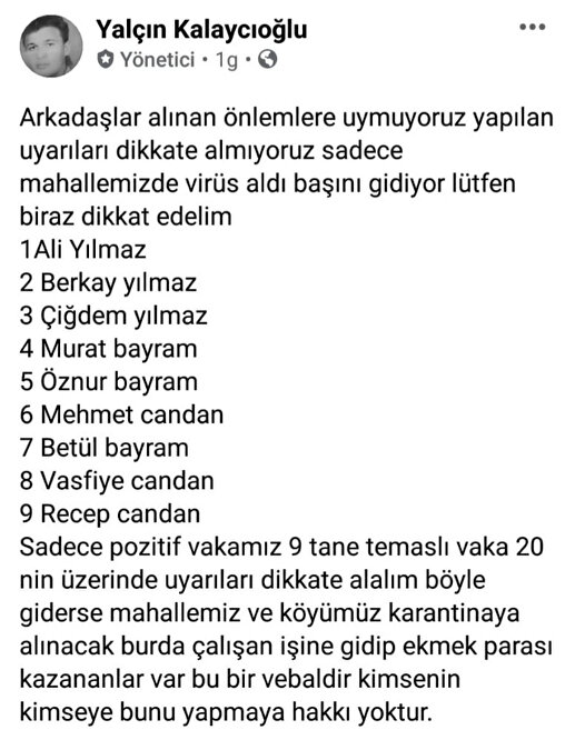 Kalaycıoğlu köyü Muhtarı Yalçın Kalaycıoğlu, sosyal medya hesabından yaptığı paylaşımda virüse yakalanan köylülerin isimlerini paylaşarak, dikkatli ve tedbirli olunmasını istedi.