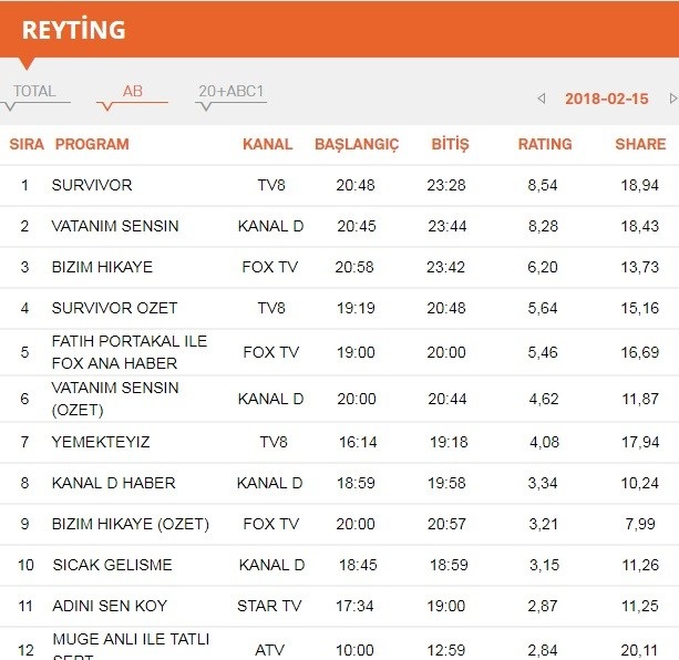 15 Şubat reytinglerinde total bazında Survivor birinci sırada, Bizim Hikaye ikinci sırada yer alıyor.