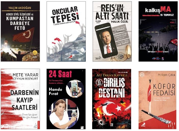 Erdem Yayınları'ndan çıkan Okçular Tepesi isimli kollektif kitap da hain darbe girişiminin kahramanlarını anlatıyor. O gece vatan uğruna mevziyi terk etmeyen 64 kahramanın hikayesinin anlatıldığı kitabın editörlüğünü Gülcan Tezcan, Halil İbrahim İzgi ve Turgay Bakırtaş yapmış. Yıldız Ramazanoğlu, Suavi Kemal, Bülent Onat gibi yazarların imzaları olan çalışmada Cumhurbaşkanlığı Genel Sekreter Yardımcısı ve Sözcüsü İbrahim Kalın'ın yakın dostu Erol Olçok'u anlattığı “Şehit Erol Olçok'a” başlıklı yazısı da yer alıyor. Truva Yayınları'ndan çıkan Haluk Özdil imzalı Reis'in Altı Saati de dikkat çekici çalışmalardan. IQ Kültür Sanat Yayınları'ndan Abdülkerim Cantürk'ün Hannas'ın 15 Temmuz İşgal Girişimi isimli kitabı ise terör örgütü mensuplarının nasıl bu hale geldikleri inceleniyor. Yine Alfa Yayınlarından çıkan Yalçın Akdoğan'ın köşe yazılarını topladığı Kumpastan Darbeye Fetö kitabı kısa sürede üçüncü baskısını yaptı.