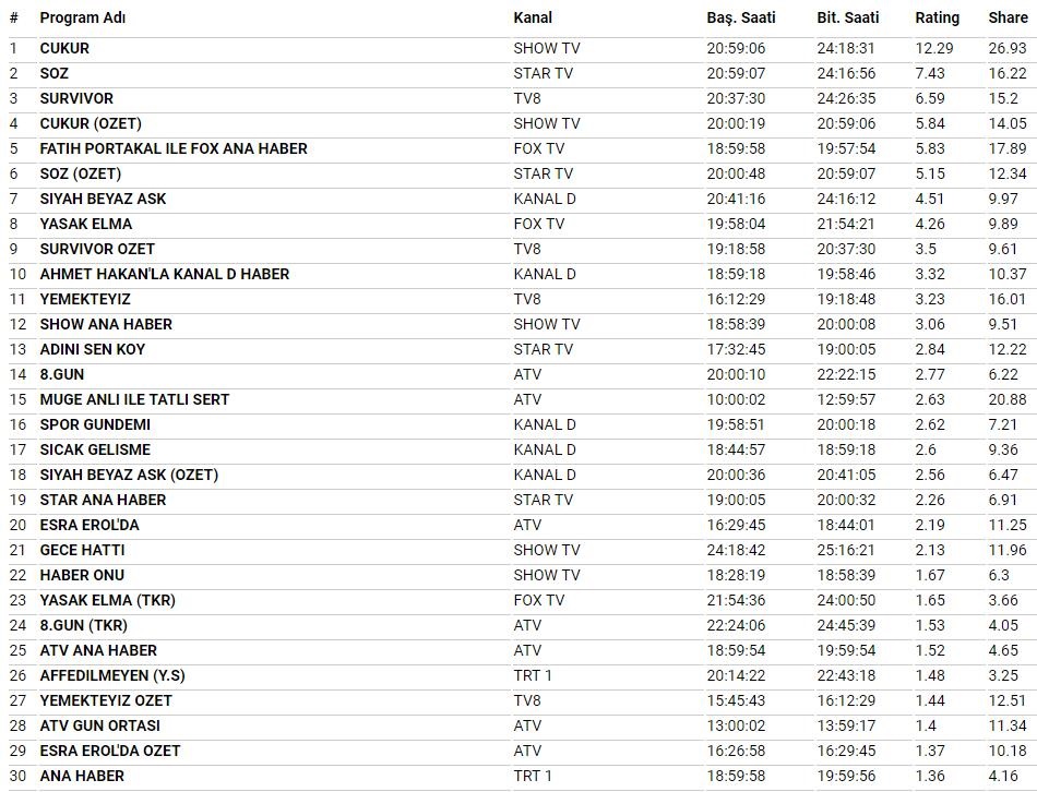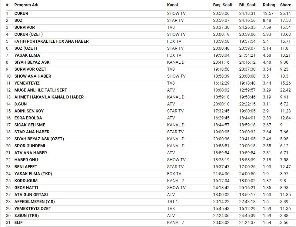 Türk dizilerin ve programlarının devam etmesinde bir kriter olan reytingler yapımcıların hayatında önemli bir yer tutuyor. 19 Mart reyting sonuçları bu açıdan oldukça önem taşıyordu. Çukur dizisi Total, AB ve ABC1'de birinci oldu.