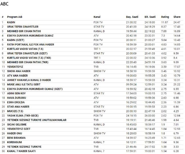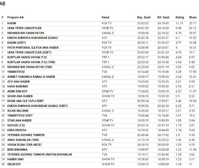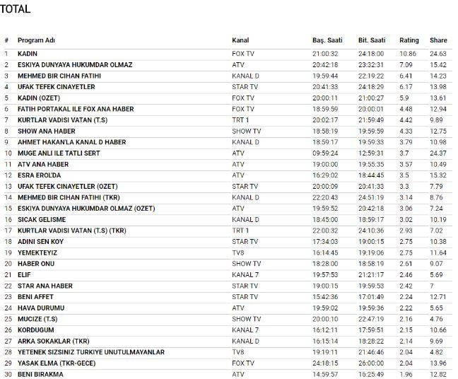 Reyting sonuçları belli oldu. 20 Mart Salı reyting sonuçlarında kim birinci oldu? Kadın mı? Eşkiya mı? Mehmed Bir Cihan Fatihi mi? 20 Mart reyting sonuçlarını açıklanmasının ardından günü zirvede bitiren program 'Kadın' dizisi oldu. Total puan türünde 24.63 share alan Kadın dizisi birinci, 15.42 share alan Eşkıya Dünyaya Hükümdar Olmaz ikinci, 14.23 share alan Mehmed Bir Cihan Fatihi üçüncü oldu.