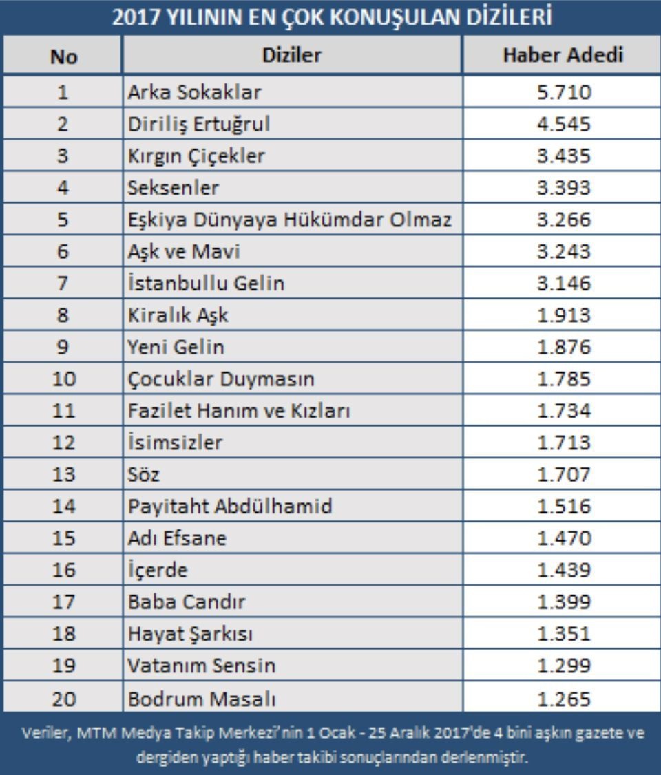 Medya Takip Merkezi, 2017 yılı boyunca yazılı basında en çok konuşulan yerli dizileri araştırdı. Araştırmaya göre 12 yıldır ekrana gelen Arka Sokaklar birinci, Diriliş Ertuğrul ikinci, Kırgın Çiçekler ise üçüncü oldu.