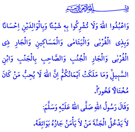 “Allah’a kulluk edin ve O’na hiçbir şeyi ortak koşmayın. Anne babaya, akrabaya, yetimlere, yoksullara, yakın komşuya, uzak komşuya, yakın arkadaşa, yolcuya, ellerinizin altında bulunanlara iyi davranın. Allah kendini beğenen ve böbürlenip duran kimseyi asla sevmez.”