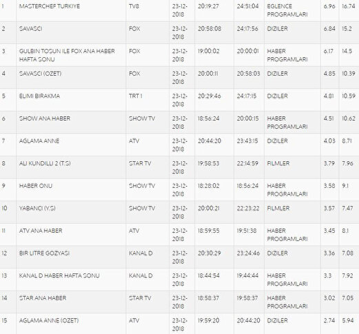 Reyting sonuçlarına göre listeye giren diziler ve programlar belli oldu. Masterchef final bölümü ile Total’de ve AB’de birinci oldu. Savaşçı dizisi reyting sonuçlarına göre diziler arasında birinci genel görünümde ikinci olurken, dizi sıralamasında beşinci sırada Elimi Bırakma geldi, Bir Litre Gözyaşı dizisi ise total sıralamada on ikinci oldu.