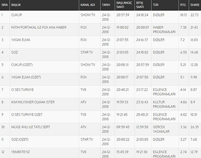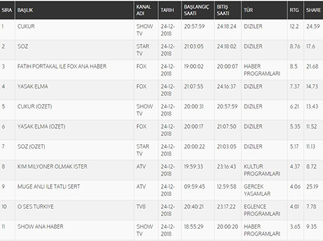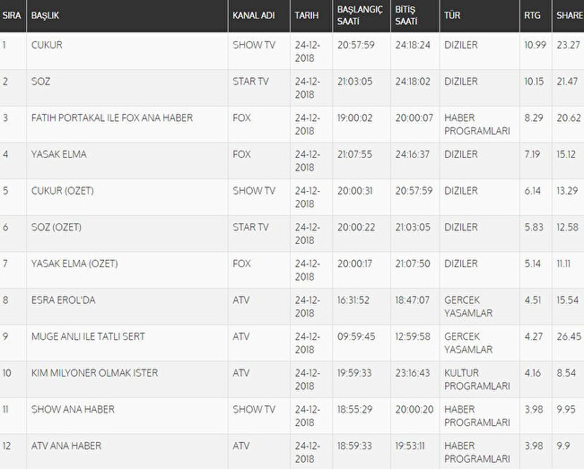 Televizyon ekranlarında 24 Aralık tarihinde en çok izlenenler belli oldu ve reyting sonuçlarına göre birinci olan yapım açıklandı. 24 Aralık reyting sonuçlarına göre total raporunda birinci olan dizi Çukur oldu, Çukur dizisini ikinci sırada Söz takip etti.