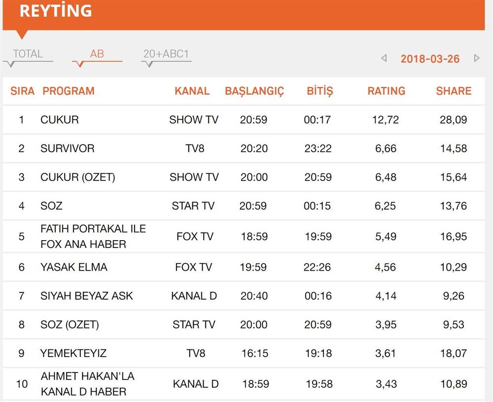 26 Mart Pazartesi reyting sonuçları açıklandı. Buna göre Çukur dizisi Total, AB ve ABC olmak üzere 3 puan türünde zirvede yer aldı. İşte 26 Mart Pazartesi reyting sonuçları...