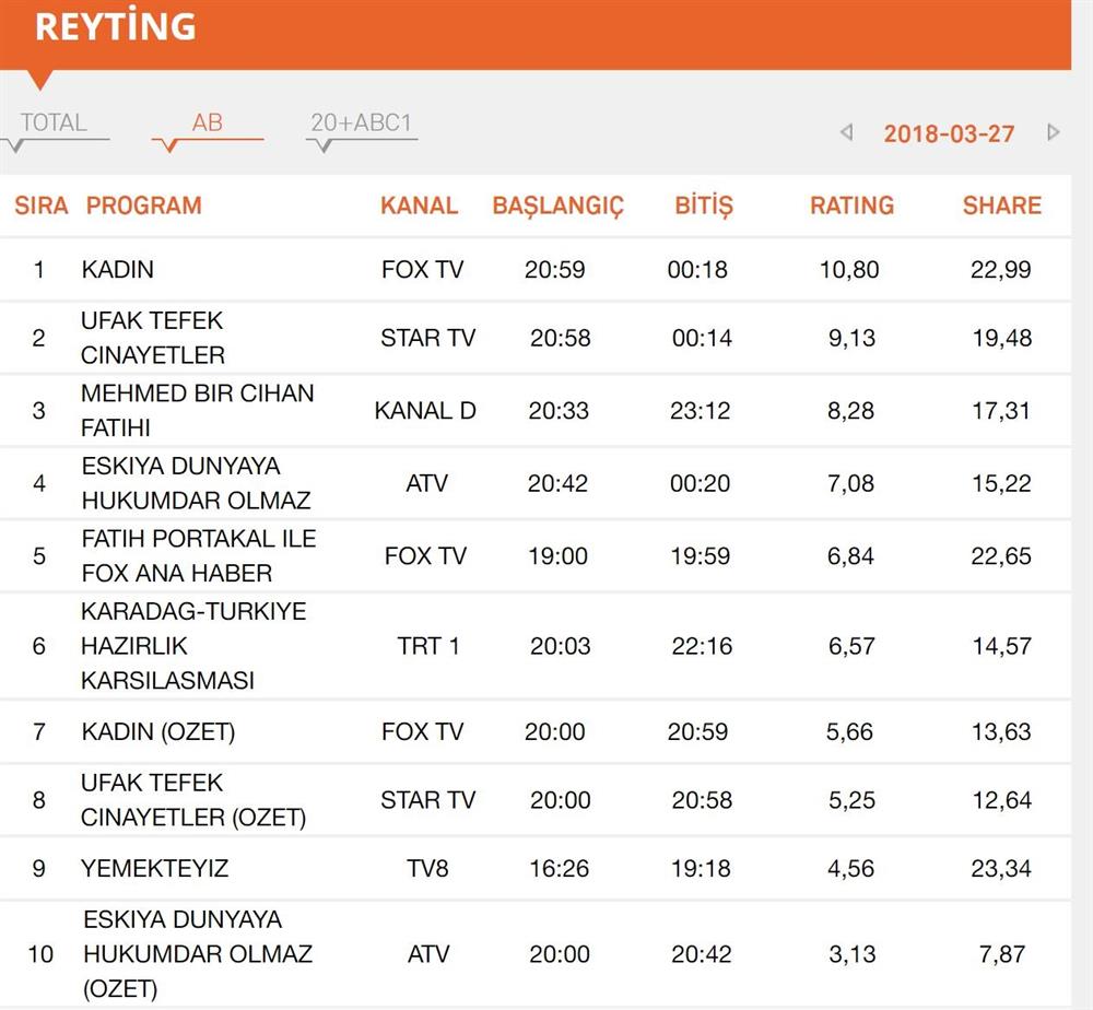 27 Mart Salı reytingleri açıklandı. Türkiye, 27 Mart 2018 Salı reyting sonuçlarını dört gözle bekliyordu. Çünkü Mehmed Bir Cihan Fatihi dizisinin dün ikinci bölümü yayınlanmıştı. En sonunda 27 Mart 2018 Salı reyting sıralaması belli oldu. Liderliği kaptırmayan Kadın dizisi Total'de, AB ve ABC puan türlerinde zirvede yer aldı. İşte 27 Mart Salı reyting sonuçları...