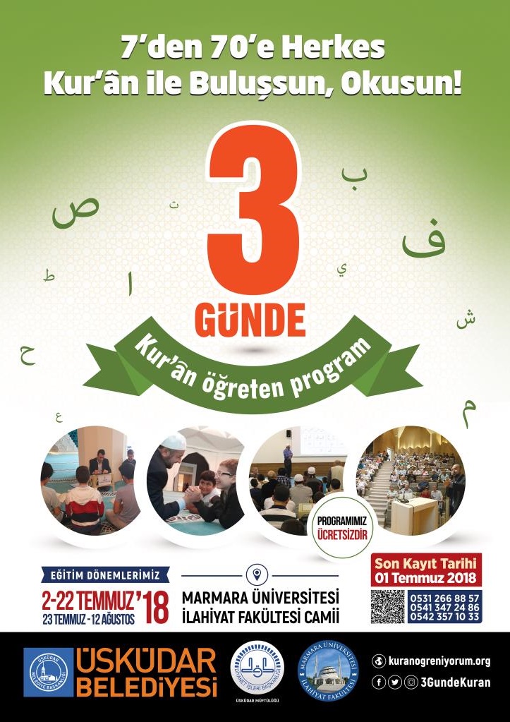 "3 Günde Kur'an Öğreten Program" bu yıl da Üsküdar Belediyesi tarafından gerçekleştirilecek. 2-22 Temmuz ve 23 Temmuz-12 Ağustos arasında düzenlenecek program Marmara Üniversitesi İlahiyat Fakültesi Cami'nde yapılacak.