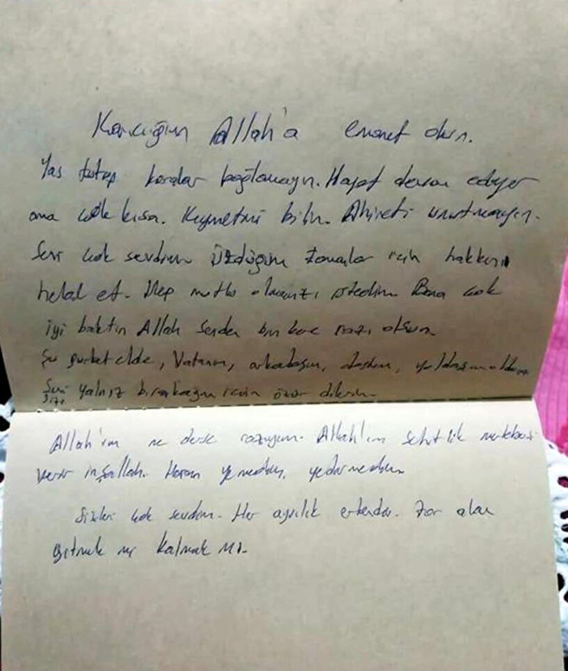 - "Karıcığım, Allah'a emanet olun. Yas tutup karalar bağlamayın. Hayat devam ediyor ama çok kısa. Kıymetini bilin. Ahireti unutmayın. Seni çok sevdim. Üzdüğüm zamanlar için hakkını helal et. Hep mutlu olmanızı istedim. Bana çok iyi baktın. Allah, senden bin kere razı olsun. Şu gurbet elde vatanım, arkadaşım, dostum, yoldaşım oldun. Seni, sizi yalnız bırakacağım için özür dilerim. Allah'ım ne derse razıyım. Allah'ım şehitlik mertebesi verir inşallah. Haram yemedim, yedirtmedim. Sizleri çok sevdim. Her ayrılık erkendir. Zor olan gitmek mi, kalmak mı."