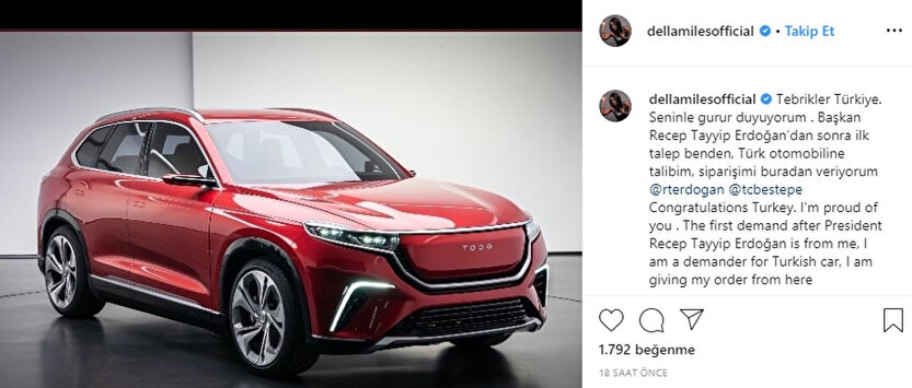 Amerikalı sanatçı Della Miles, sosyal medya hesabından yaptığı paylaşımda, "Türk otomobiline talibim, siparişimi buradan veriyorum" diye yazdı.