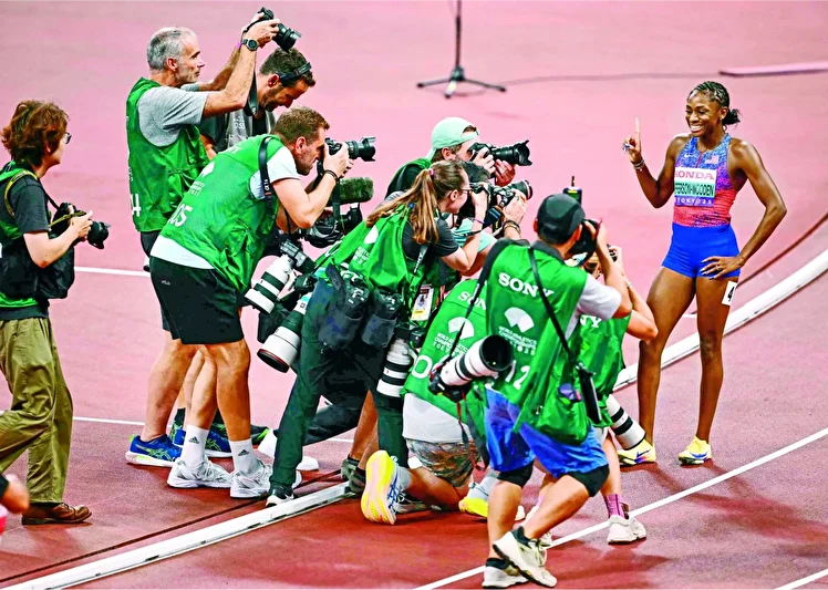 Tokyo’daki Dünya Atletizm Şampiyonası’nda ABD’li Melissa Jefferson-Wooden başarısının tadını çıkarıyor. 100 metrede kazandığı başarı onu hatırı sayılır bir üne kavuşturacak. Fotoğrafçılar bu anı kaçırmak istemiyor ve başka bir fotoğrafçı da açısını değiştirip daha geniş bir açıdan bakıyor.