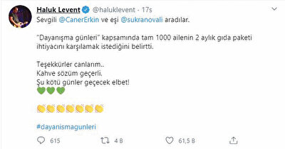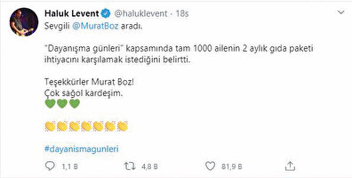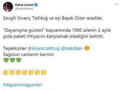 - Sanatçı Haluk Levent, “29 Mart itibarıyla 8 bin rakamına ulaştık. Hedefimiz salgın nedeniyle işinden gücünden olmuş 10 bin aileye gıda kolisi desteğinde bulunmak” dedi. Levent, kampanya kapsamında gıda firmalarının kendilerine indirimler yaptığını, kolilerin içinde un, şeker, mercimek, fasülye, nohuta kadar birçok önemli temel gıda maddesinin olduğunu ifade etti. Levent, şunları kaydetti: “Bugünleri hep birlikte birbirimize destek olarak atlatacağız. Ben kampanyamıza destek olan tüm dostlarımıza teşekkür ediyorum.”