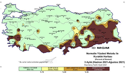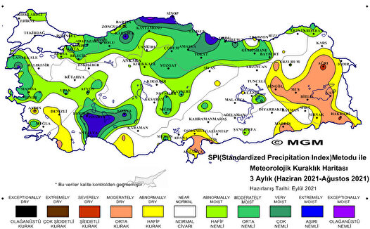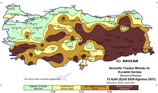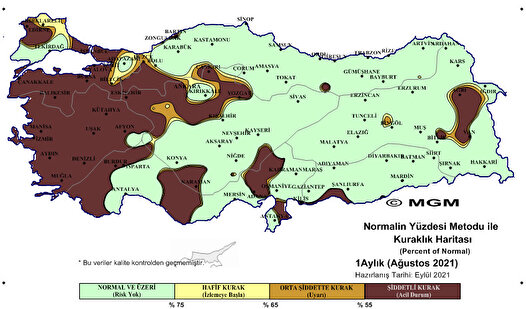 - PNI metoduna göre 2021 Ağustos ayı Meteorolojik Kuraklık Durumu'na göre, 1 aylık (Ağustos 2021) haritada, Ege Bölgesi'nin tamamı, Marmara Bölgesi'nde İstanbul dahil, Tekirdağ haricindeki diğer bölgeler için 'acil durum' ibaresiyle de uyarının bulunduğu 'şiddetli kurak' ölçümü yapıldı.