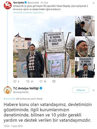 Antalya'da iki gözü görmeyen 88 yaşındaki Hasan Başdaş'ın çöp topladığı görüntüler tüm Türkiye'yi derinden üzdü. Başdaş'ın 2 torununa, eşine ve cezaevindeki oğluna baktığına dair haberlere Antalya Valiliği'nden açıklama geldi: "Habere konu olan vatandaşımız, devletimizin gözetiminde, ilgili kurumlarımızın denetiminde, bilinen ve 10 yıldır gerekli yardım ve destek verilen bir vatandaşımızdır."