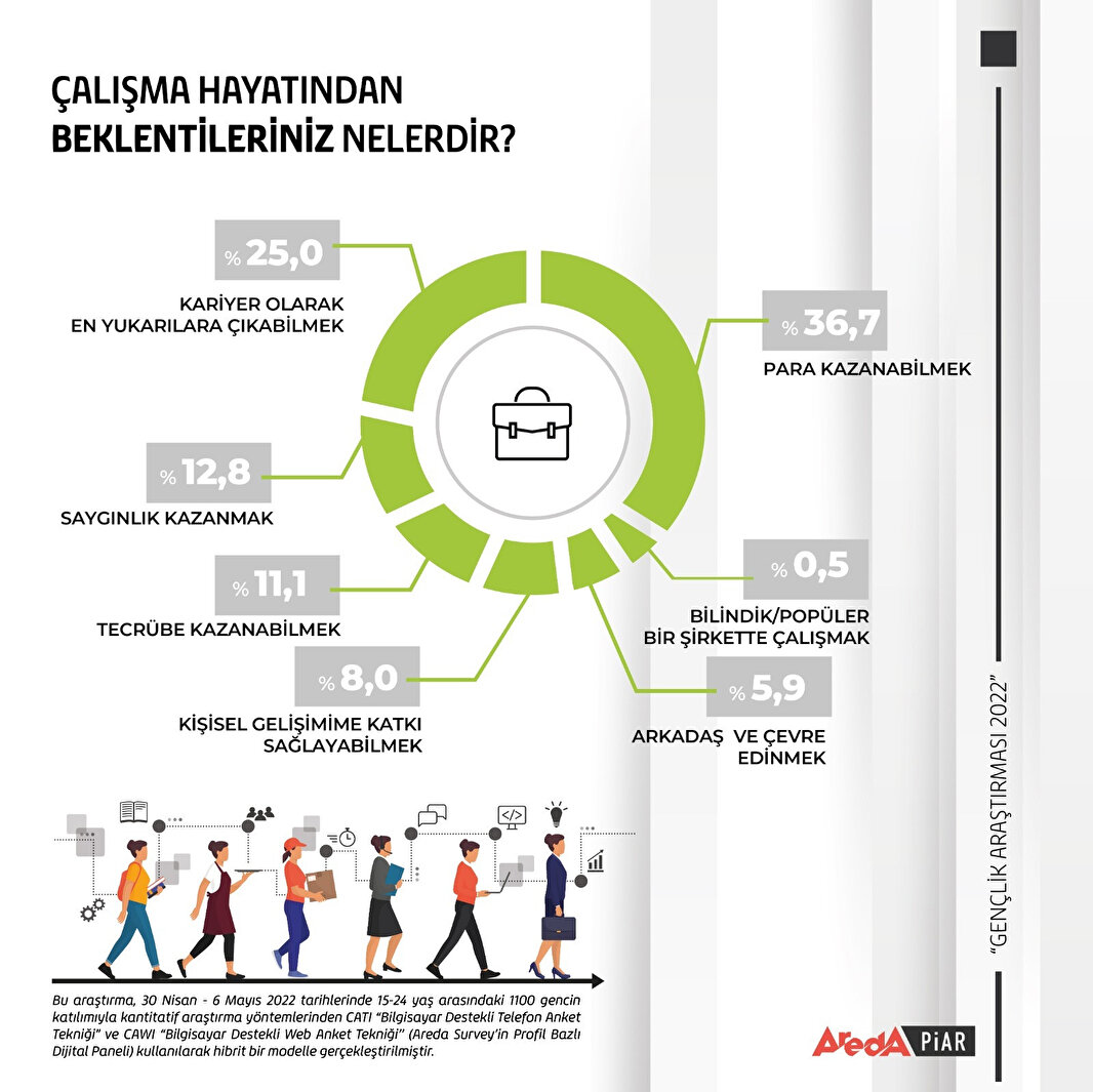 Aynı araştırmada gençlere çalışma hayatından beklentileri sorulduğunda, yüzde 36,7 para kazanmak yanıtını verdi. Kariyer yüzde 25,0, saygınlık kazanmak yüzde 12,8, tecrübe kazanabilmek yüzde 11,1, kişisel gelişimime katkı sağlayabilmek yüzde 8,0, arkadaş ve çevre edinmek yüzde 5,9 ve bilinir/popüler bir şirkette çalışmak 0,5 ile diğer faktörler olarak sıralandı.