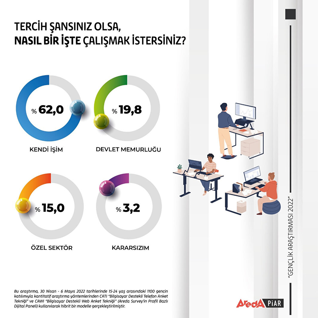 Araştırma şirketi Areda Piar, Türkiye’de gençlik yapısının ele alındığı çalışmayı yayınladı. 15-24 yaş aralığında, Türkiye genelinde Z kuşağından bin 100 genç ile yapılan çalışmada, Türkiye’de gençlerin değerlere bakışı, kariyer planları, iletişim araçları ile ilişkileri, kültürel tercihleri ve kimlik algıları gibi konular masaya yatırıldı. Araştırma sonuçlarına göre, girişimci yönlerinin ağır olduğunu düşünen Z kuşağı, yüksek oranda kendi işini kurmak istiyor.