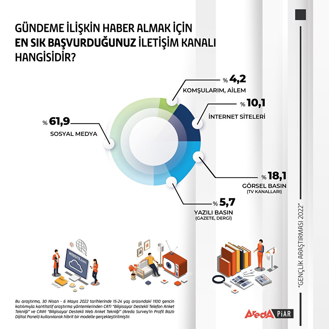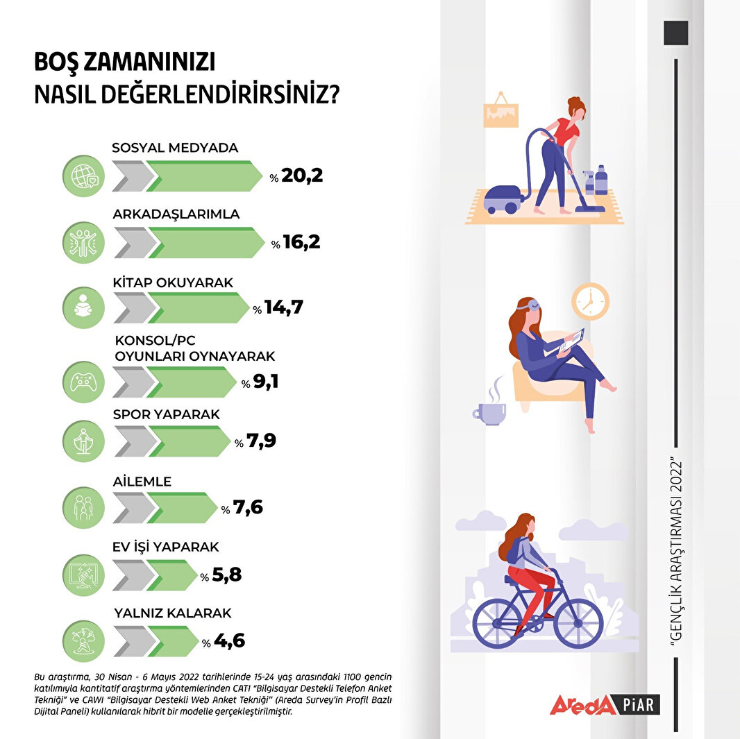 Araştırma sonuçlarına göre, gençler için sosyal medyada online veya offline arkadaşlarla vakit geçirmek en önemli boş zaman değerlendirme yöntemi. Araştırmada genç katılımcılara “Boş zamanınızı nasıl değerlendirirsiniz?” diye sorulduğunda, yüzde 20,2’si sosyal medyada, yüzde 16,2’si arkadaşlarımla, 14,7’si kitap okuyarak, yüzde 9,1’i konsol oyunları/pc oyunları oynayarak, yüzde 7,9’u spor yaparak, yüzde 7,6’sı ailesiyle, yüzde 5,8’i ev işi yaparak ve yüzde 4,6’sı yalnız kalarak yanıtını verdi.
