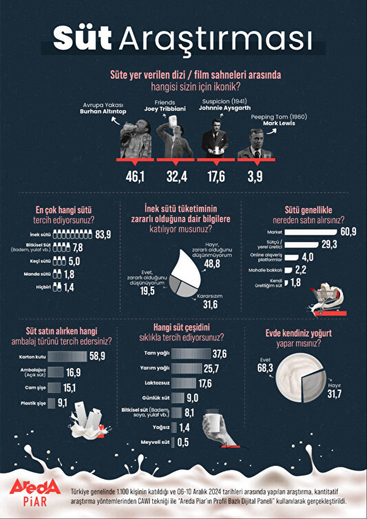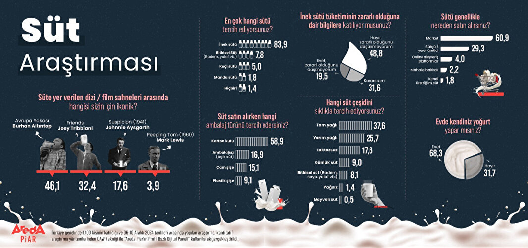 Areda Piar araştırma şirketi, Türk halkının süt tüketim alışkanlıklarını inceledi. Araştırmaya göre, Türk halkının yüzde 83,9’u inek sütü tüketirken yüzde 19,5’i inek sütünün sağlıksız olduğunu savunuyor. Yüzde 58,9’u ambalaj tercihini karton sütten yana kullanırken yüzde 16,9’u ise markasız /açık süt satın alıyor. Türk halkı süt alışverişini ağırlıklı olarak marketlerden (yüzde 60,9) yapıyor ancak halkın yüzde 29,3’ü yerel sütçülerden süt almayı tercih ediyor. Araştırmanın eğlenceli kısmında ise dizi ve filmler arasındaki en ikonik süt sahneleri yer alıyor ve yüzde 46,1 ile Avrupa Yakası’nın unutulmaz karakteri Burhan Altıntop’un öne çıkıyor.