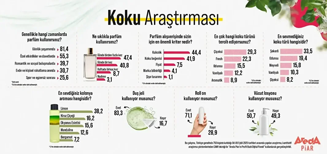 Bir elimde ayna, bir elimde parfüm dönemi. Parfüm artık sadece özel günlerin değil, günlük yaşamın vazgeçilmezi haline geldi. Areda Piar’ın “Koku Araştırması”na göre katılımcıların yüzde 81,4’ü işe, okula veya alışverişe giderken parfüm kullanıyor. En çok tercih edilen koku türü çiçeksi yüzde 29,3 olurken, şekerli kokular yüzde 33,5 ile en az sevilenler arasında yer aldı.