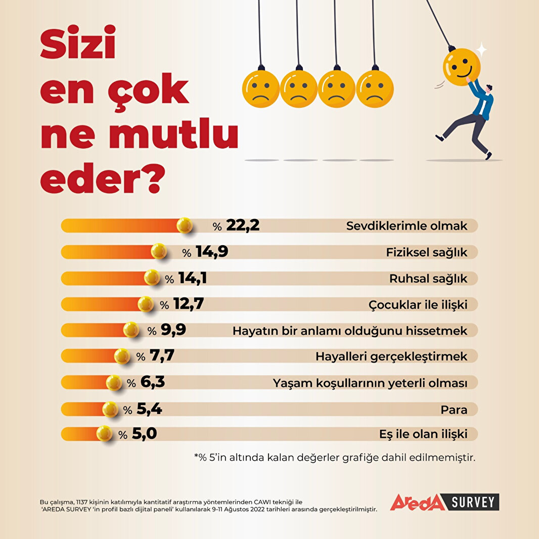 Areda Survey tarafından 9 -11 Ağustos 2022 tarihleri arasında gerçekleştirilen mutluluk araştırmasına bin 137 kişi katıldı. Araştırma kantitatif araştırma yöntemlerinden CAWI tekniği ile “Areda Survey’in Profil Bazlı Dijital Paneli” kullanılarak gerçekleştirildi.