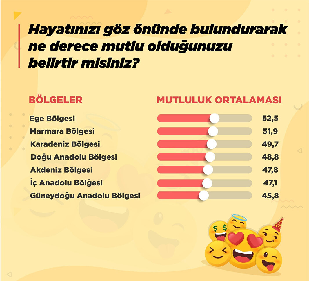 Mutluluk oranlarının bölgelere göre ele alındığı araştırmada, Ege Bölgesi yüzde 52,5 ile en mutlu bölge olurken onu sırasıyla yüzde 51,9 ile Marmara Bölgesi, yüzde 49,7 Karadeniz Bölgesi, yüzde 48,8 Doğu Anadolu Bölgesi, yüzde 47,8 ile Akdeniz Bölgesi, yüzde 47,1 ile İç Anadolu Bölgesi ve yüzde 45,8 ile Güneydoğu Anadolu Bölgesi takip etti.