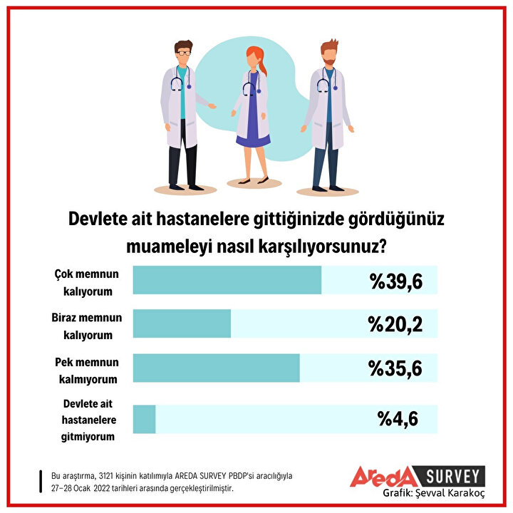 Bu veriler, devlet hastanelerinden memnuniyet düzeyinin yüksek olduğunu gösterirken, katılımcıların yüzde 4,6’sının sağlık konusunda devlet hastanelerinden yararlanmadığını ortaya koydu.