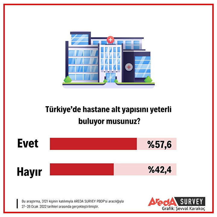 Areda Survey’in her ay düzenli olarak hazırladığı “Sosyometre” araştırmasının ocak ayı dosyasında, Türkiye’deki hastanelerin hizmet ve altyapı konusu ele alındı. 3.121 kişi ile gerçekleştirilen araştırmaya göre, katılımcıların yüzde 57,6’sı Türkiye’deki hastanelerin altyapısını yeterli buluyor.