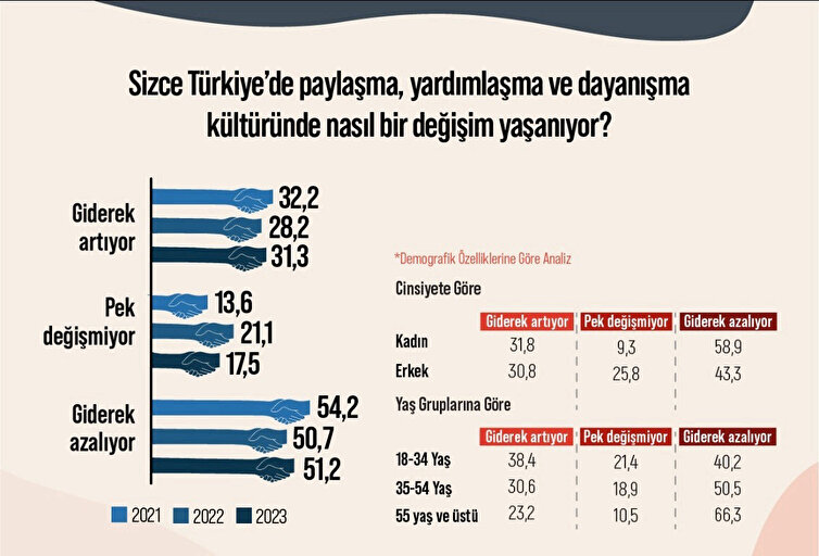 Türkiye genelinde 2 bin 94 kişinin katılımıyla gerçekleşen araştırmaya göre, halkın yüzde 51,2’si Türk toplumunun dayanışma ruhunun giderek azaldığını düşünüyor. 2021’de yüzde 54,2 ve 2022’de yüzde 50,7 olmak üzere dayanışma kültürünün azaldığını söyleyenler ağırlıkta çıkmıştı.
