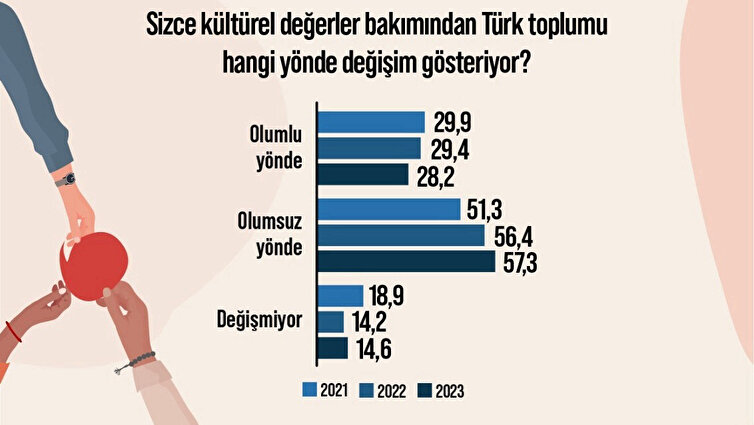 Araştırma kapsamında katılımcılara, kültürel değerler bakımından Türk toplumunun hangi yönde değişim gösterdiği de soruldu. Türk halkının yüzde 57,3’ü olumsuz yönde değişimin olduğunu söylerken, yüzde 28,2’si olumlu yönde değişimin olduğunu düşünüyor. Değişim yaşanmadığını düşünenler ise yüzde 14,6 oranına sahip.