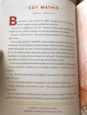Söz konusu skandal kitapta yer alan bir hikayede, kendisini 'kız gibi' hisseden Amerikalı Coy Mathis isimli bir erkek çocuğunun cinsiyet değiştirme süreci özendirilerek anlatılıyor.