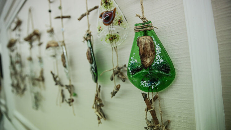 Serginin en dikkat çekici parçalarından birini de yumurta kolisinden gelin çiçeği, gelin tacı, atık kartondan yapılan nikah şekeri kutusu oluşturuyor. Sergide ayrıca eritilen soda şişelerinin odun parçalarıyla birleştirilmesi sonucu ortaya çıkan dekoratif ürünler de yer alıyor.