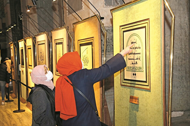 - Hat sanatçısı ve yazar Prof. Uğur Derman da açılışta bir konuşma yaptı. Derman, Ayasofya’daki hat levhalarının tek parti döneminde yerlerinden indirildiğini, 1949’da ise bazı hayırseverlerin girişimiyle yerlerine geri asıldığını anlattı. Derman şöyle devam etti: “Nereden nereye geldik. Geçmiş yıllarda bize Ayasofya’nın cami olmasından bahsedildiğinde katiyen ihtimal vermezdik böyle bir şeye. Düşünemezdik. Allah müzeyi camiye çevirenlerden razı olsun. Biz de şimdi böyle hat ile ilgili bir sergide bulunabiliyoruz, ne büyük bahtiyarlık. Bunun için vesile olanlara teşekkür ediyorum, Allah razı olsun diyorum.”