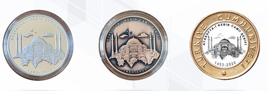 Ayasofya Camisi’nin yeniden ibadete açılmasına özel tedavül para ve hatıra para basıldı. Özel tedavül 1 TL’lerin arka yüzeyine Ayasofya-i Kebir Cami-i Şerifi’nin resmi basılarak üretim yapıldı ve bugün itibariyle piyasaya sürülecek. Darphane tarafından koleksiyonerlere yönelik 5 bin adet gümüş ve 10 bin adet bronz hatıra para da ayrıca piyasaya sunuldu.