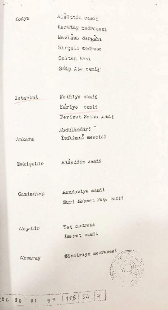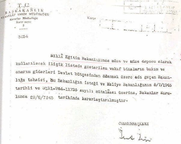 Kariye Camii’nin müzeye dönüştüren 29 Ağustos 1945 tarihli Bakanlar Kurulu kararına ulaşıldı. Kararda, “Milli Eğitim Bakanlığı’nca müze ve müze deposu olarak kullanılacak ilişik listede gösterilen vakıf binaların bakım ve onarım giderleri Devlet bütçesinden ödenmek üzere adı geçen Bakanlığa tahsisi bu Bakanlığın isteği ve Maliye Bakanlığı’nın 5/7/1945 tarihli ve 3121-744-11735 sayılı mütalaâsı üzerine, Bakanlar Kurulu’nca 29/8/1945 tarihinde kararlaştırılmıştır” ifadeleri yer alıyor.