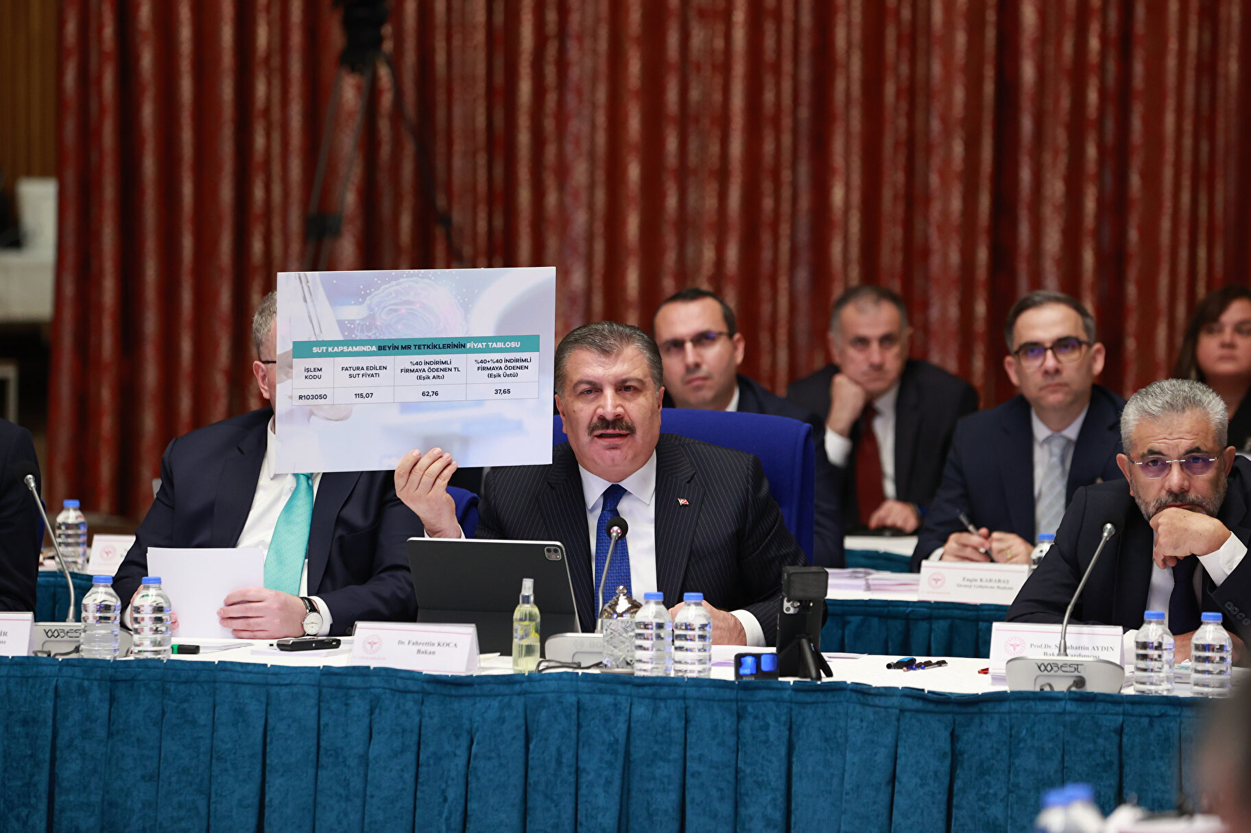 Miktara bağlı hizmetlerde eşik değerin tespit edildiğini söyleyen Bakan Koca, "Eşik değer görüntüleme ve laboratuvar hizmetleri için Sağlık Uygulama Tebliği'nin fiyatları uygulanıyor. Benim de beğenmediğim, üniversiteler için çok düşük olduğunu söylediğiniz Sağlık Uygulama Tebliği rakamları ile ihale yapılıyor. MR'dan bahsedelim. MR'ın SUT fiyatı ne kadar? 115,07. Biz daha fazla indirim alabilmek için bir eşik değerin üzerinde ola ki daha fazla talep olursa biz daha fazla indirim isteriz denilerek belirlenen eşik değere kadar yüzde 40 indirimle alıyoruz. Kaç lirayla? 62.76 lira. O eşik değerin üzerine çıktığında bir yüzde 40 indirim daha alıyoruz. Kaç lira? 37.65 lira. 37 lira ile MR çekiliyor” ifadelerini kullandı.