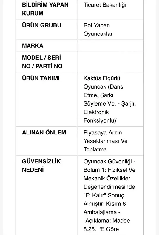 Ticaret Bakanlığı Güvensiz Ürün listesine bu kez de çok popüler olan bir oyuncak eklendi. Kaktüs figürlü dans eden ve ses çıkaran oyuncak 'güvensiz' bulunurken, 'boğulma riski' oluşturabileceği vurgusu yapıldı.