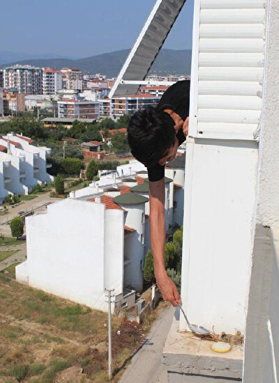 İzmir'in Torbalı ilçesinde, 16 yaşındaki lise öğrencisi Emre Topal, 8'inci kattaki evlerinin balkonunun kenarına yuva yapan kumru ve dünyaya getirdiği 2 yavrusunu, kepçe yardımıyla su ve ekmek vererek, besliyor.