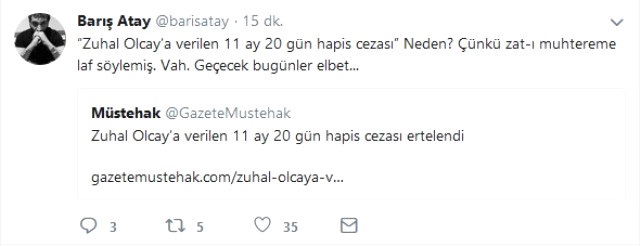 HDP Hatay Milkletvekili Barış Atay, "Cumhurbaşkanına hakaret" suçundan 11 ay 20 gün hapis cezası alan sanatçı Zuhal Olcay'a sahip çıktı. Daha önce twitter'dan da halka hakaret eden Atay, sosyal medya hesabından yaptığı paylaşımda, "'Zuhal Olcay'a verilen 11 ay 20 gün hapis cezası' Neden? Çünkü zat-ı muhtereme laf söylemiş. Vah. Geçecek bugünler elbet" ifadelerini kullanarak sahip çıktı.